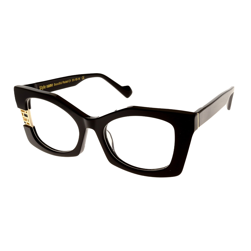 Skelet prej acetati premium në ngjyrë të zezë të thellë, me detaje metalike ngjyrë ari që i japin një pamje luksoze dhe të dallueshme. Forma moderne me linja të forta shpreh vetëbesim dhe karakter, duke e bërë këtë model ideal për gra që duan të kombinojnë elegancën me qëndrueshmërinë dhe personalitetin e fortë.