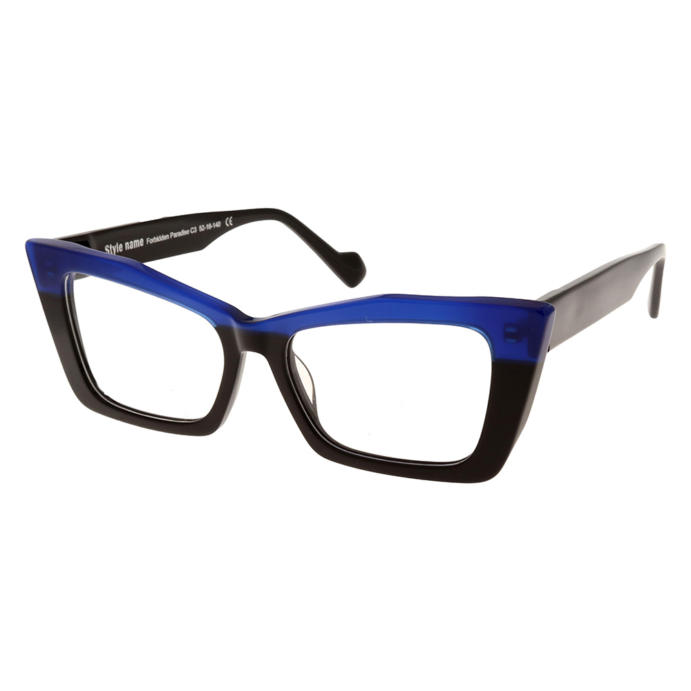 Skelet prej acetati premium, me kombinim të veçantë ngjyrash blu elektrike dhe e zezë të thellë, që krijojnë një pamje tërheqëse dhe plot energji. Forma “cat-eye” me linja të theksuara reflekton një stil modern dhe dinamik, ndërsa ndërtimi i fortë ofron qëndrueshmëri dhe komoditet.